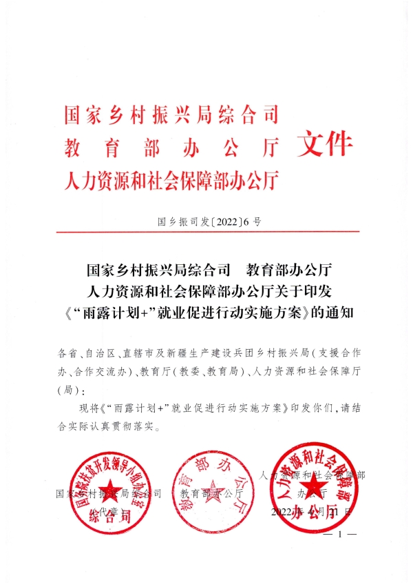 国家乡村振兴局综合司 教育部办公厅 人力资源和社会保障部办公厅关于印发 《“雨露计划+”就业促进行动实施方案》的通知